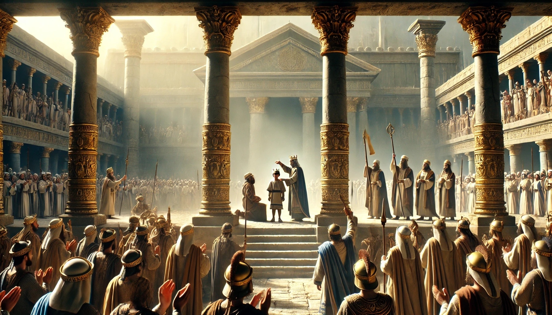 Diese Jahre sind geprägt von Geduld und stillem Vertrauen. Jojada wartet auf den richtigen Moment. Schließlich schmiedet er einen mutigen Plan. Er ruft die Hauptleute der Leibwache zusammen und bindet sie durch einen Eid an die Sache des rechtmäßigen Königs. Im Tempel organisiert er eine sorgfältig geplante Zeremonie, bei der der junge Joasch öffentlich als König vorgestellt wird.