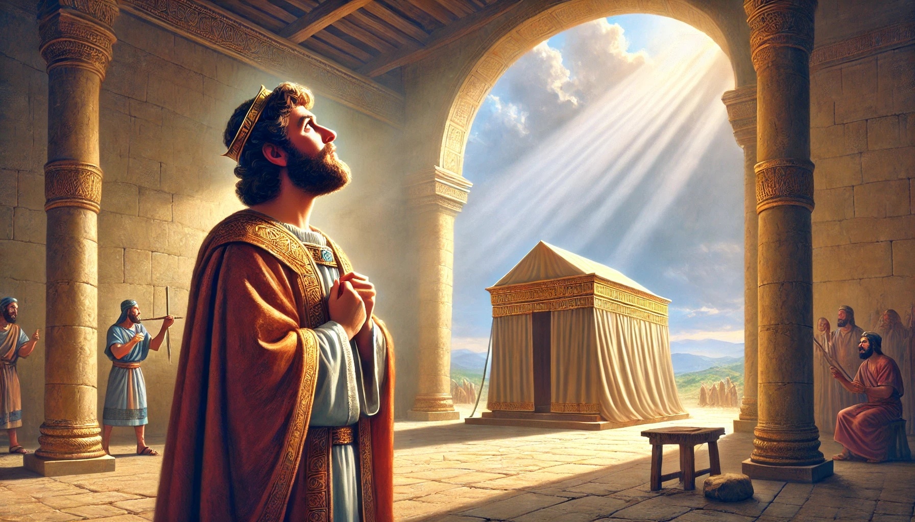 David sitzt in seinem Haus, umgeben von Ruhe und Stabilität. Er blickt auf sein Leben und erkennt: Er selbst lebt in einem festen Haus, während die Bundeslade noch in einem Zelt ist. In ihm wächst der Wunsch, Gott etwas zurückzugeben – ein Haus, würdig für seine Gegenwart.