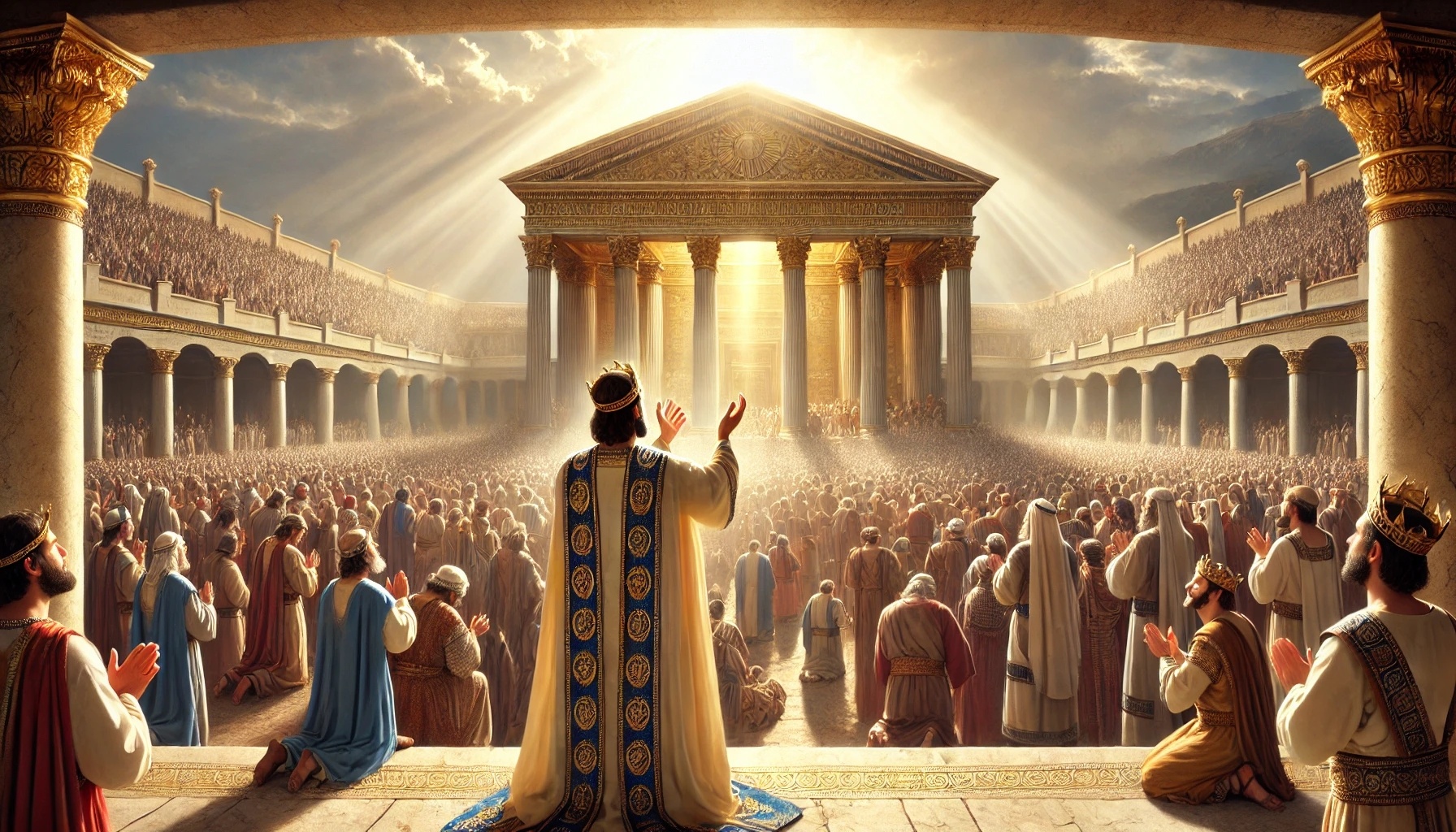 Am Ende segnet Salomo das Volk. Er ruft sie dazu auf, Gott treu zu bleiben und seine Gebote zu halten. Das Volk bringt zahlreiche Opfer dar, und das Einweihungsfest dauert viele Tage. Es ist eine Zeit groรer Freude, Dankbarkeit und Gemeinschaft.