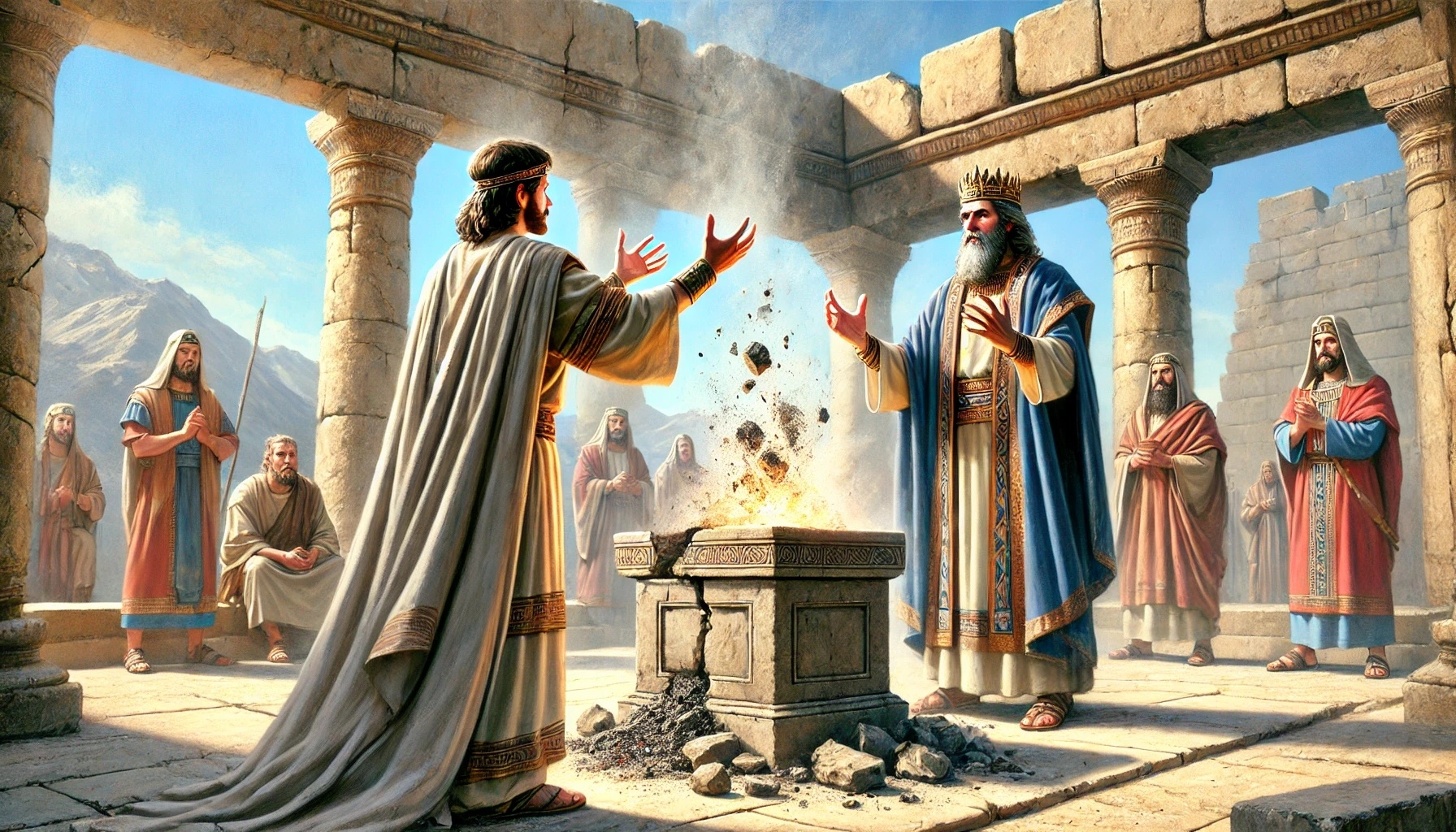 Ein Mann Gottes kommt aus Juda nach Bethel, genau an den Ort, wo Jerobeam ein eigenes Heiligtum errichtet hat. Während der König am Altar steht, tritt der Mann mutig auf und verkündet ein Gerichtswort. Er spricht von einem zukünftigen König, der diesen Altar entweihen wird. Es ist eine direkte Konfrontation – klar, furchtlos und im Auftrag Gottes.