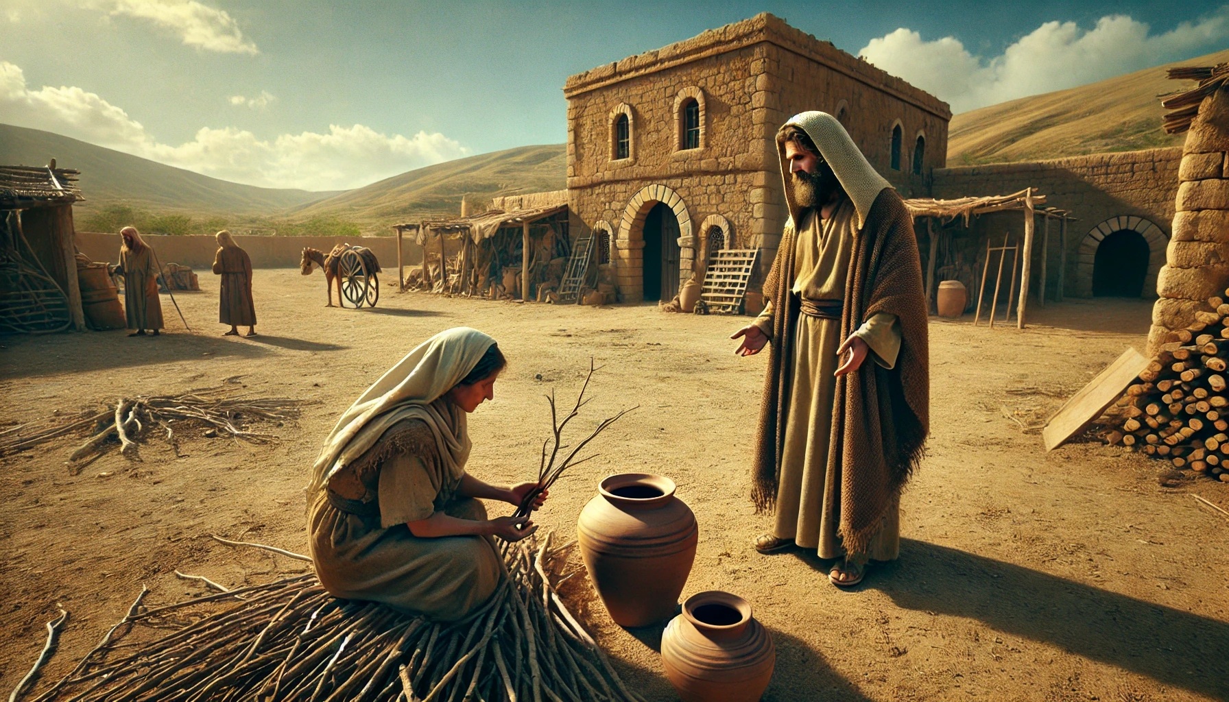 Als Elia die Stadt erreicht, sieht er eine Witwe, die Holz sammelt. Er bittet sie um Wasser – und um ein Stück Brot. Sie antwortet ehrlich: Sie habe nur noch eine Handvoll Mehl und ein wenig Öl. Sie sammle Holz, um für sich und ihren Sohn ein letztes Mahl zu bereiten – dann wolle sie sterben.