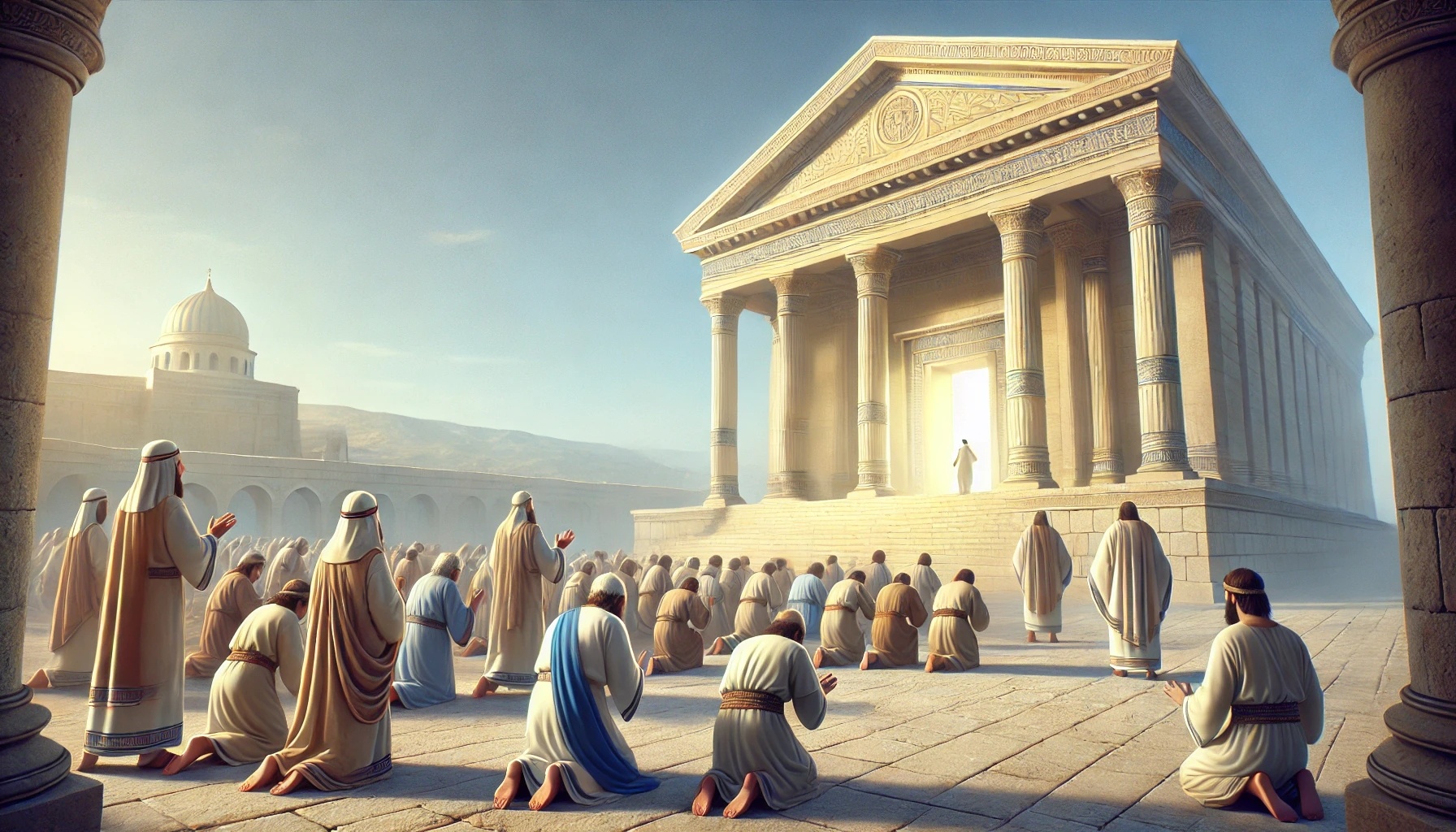 Die Herrlichkeit Gottes erfüllt erneut den Tempel. Die Priester können nicht eintreten, so stark ist seine Gegenwart. Das Volk sieht es, fällt nieder und betet an.