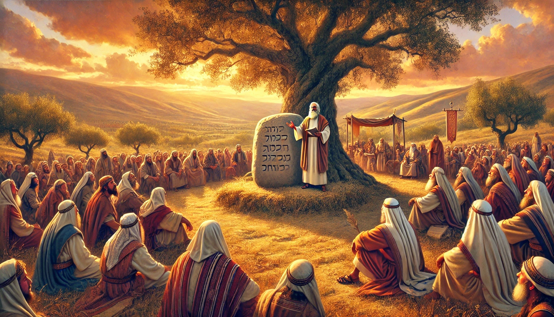 Josua erneuert mit dem Volk den Bund und errichtet einen großen Stein unter einer Eiche als Zeichen: