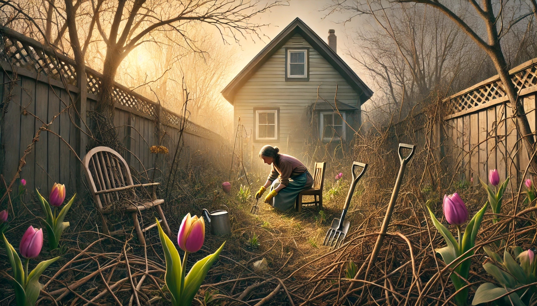 Eines Frühlingstages stand sie wie aus einem Impuls heraus an der Gartentür. Der Anblick schmerzte: Unkraut, totes Holz, trockene Erde. Doch da war auch ein Hauch von Hoffnung. In einer Ecke blühte eine kleine, einsame Tulpe.
